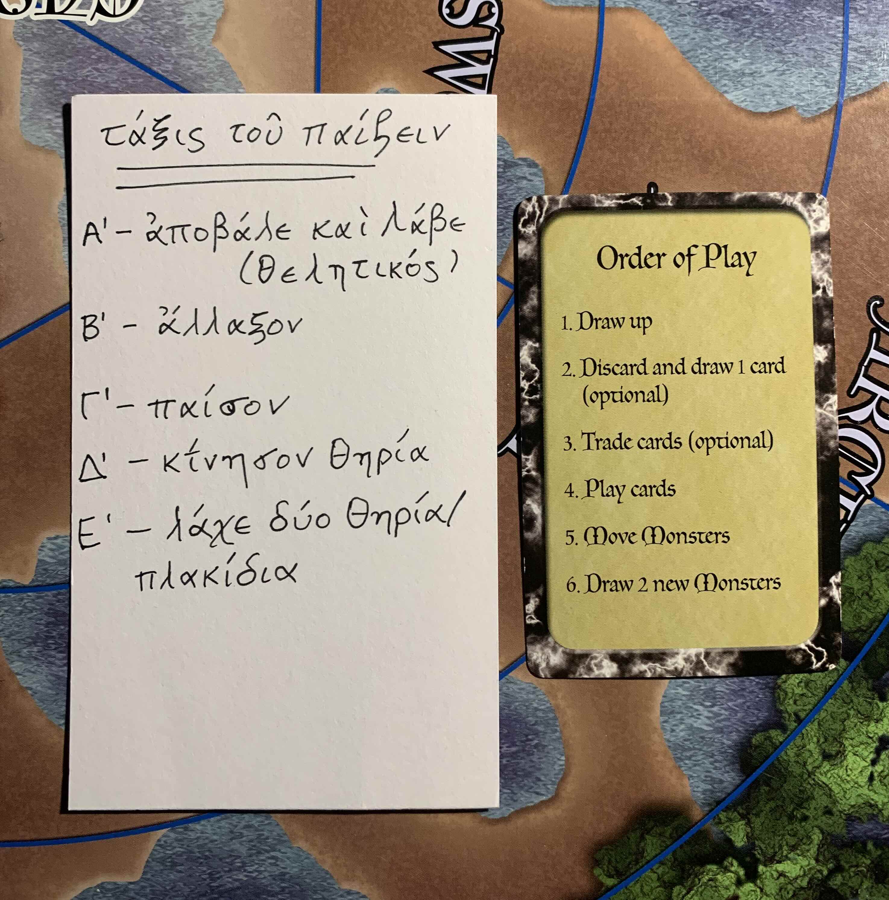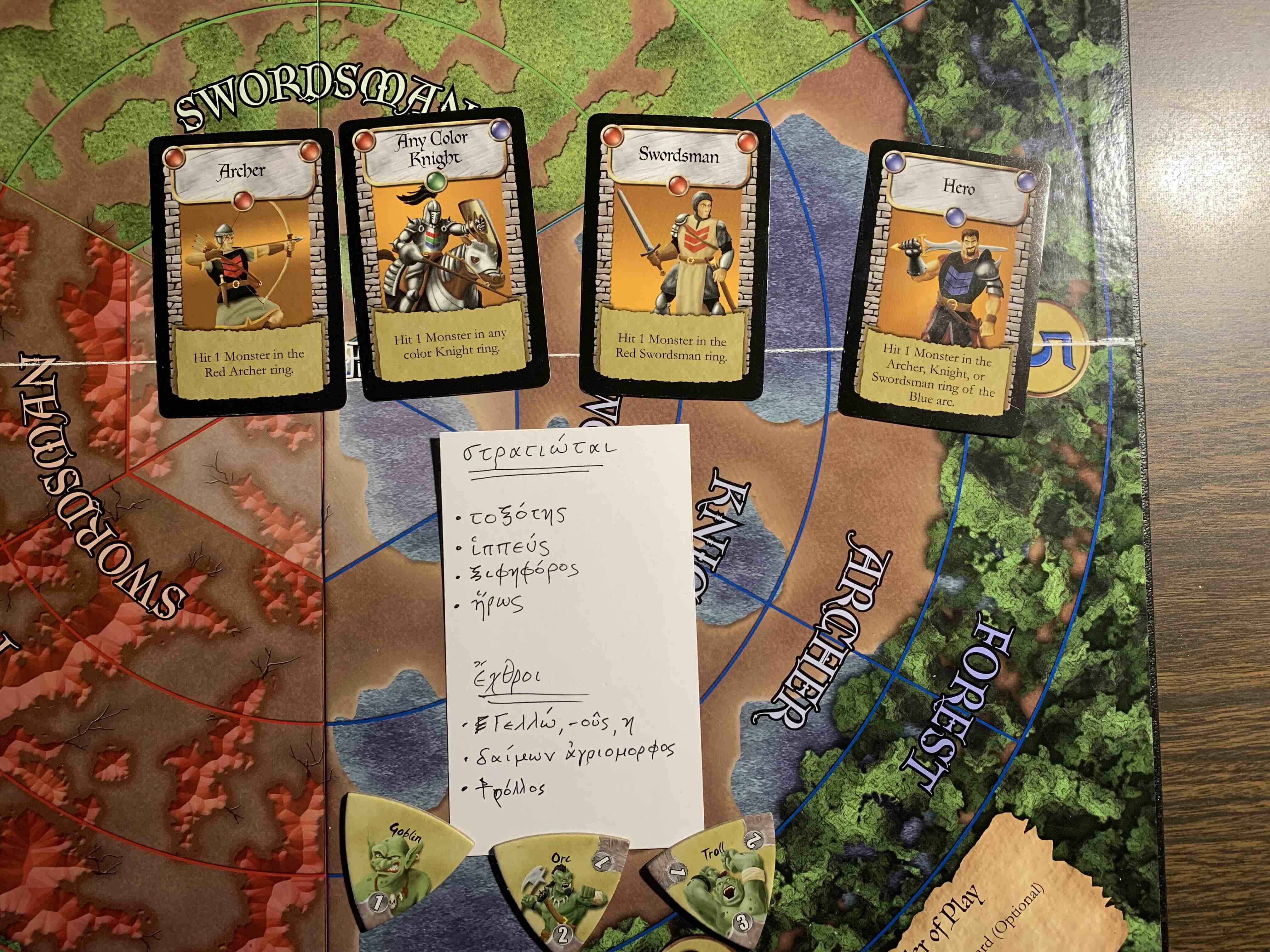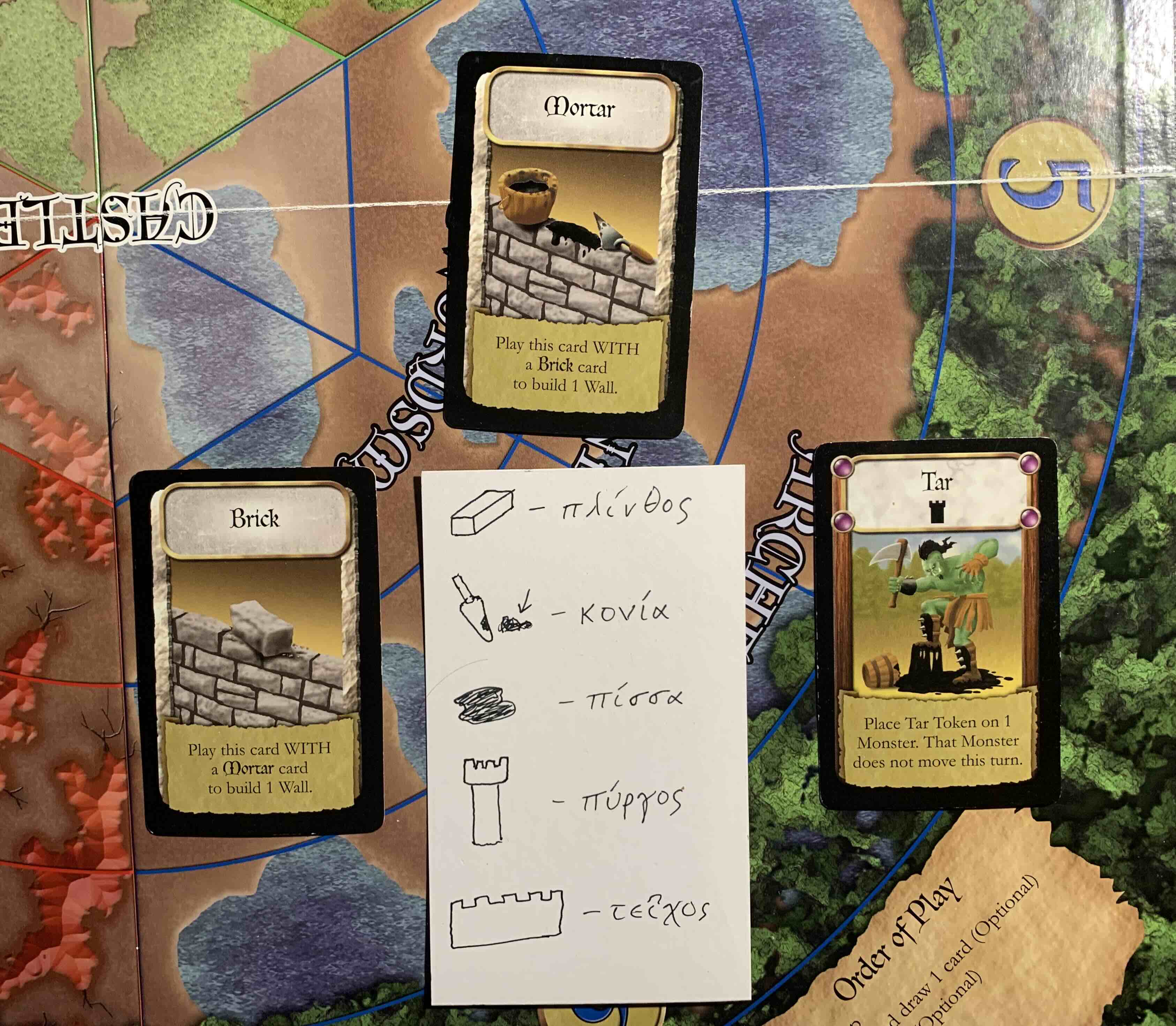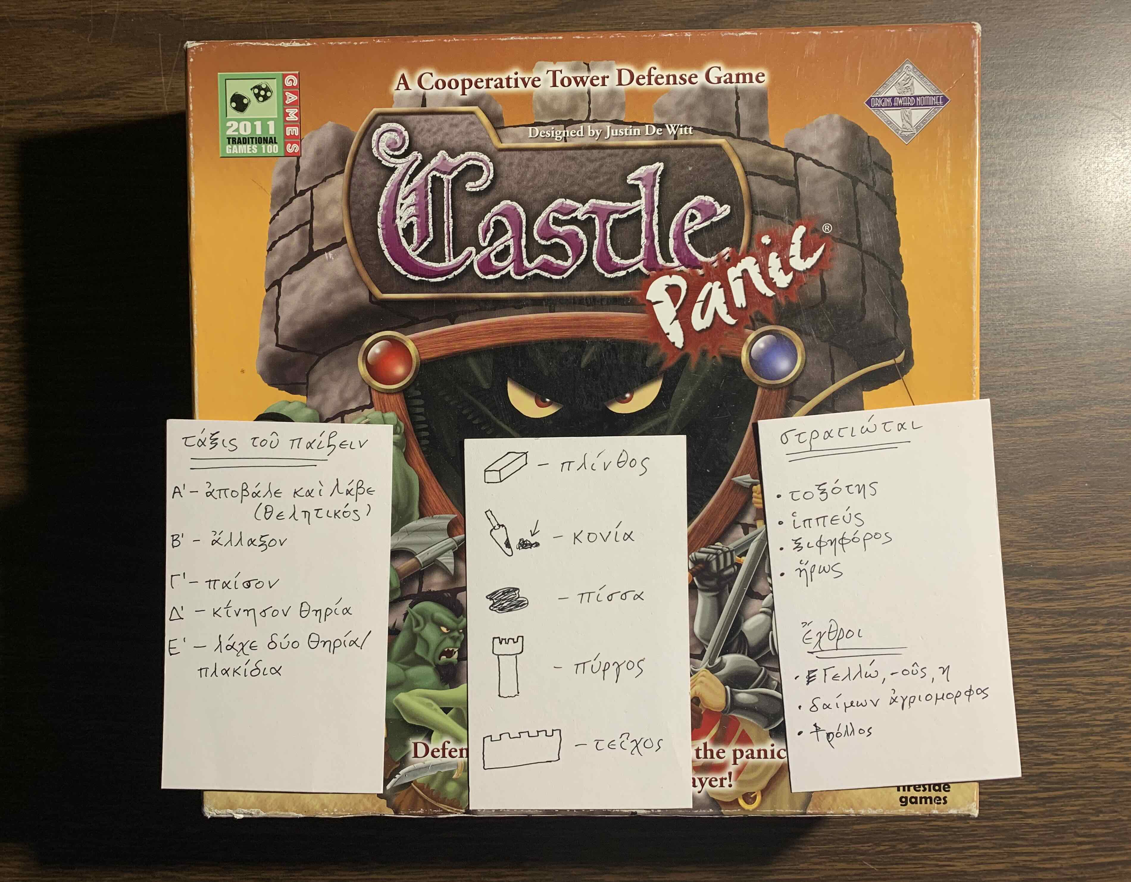 Reading Greek is a lot of fun all by itself, but adding in some gaming can make it even better. A few years ago, I took a class with Seumas in which, instead of reading, we played an RPG in Latin. Here is his retrospective. That was a lot of fun! We need more of this. In my previous post I mentioned playing games at the Polis event. This post is about one of those. I now present to you Castle Panic: Unofficial Ancient Greek Edition.